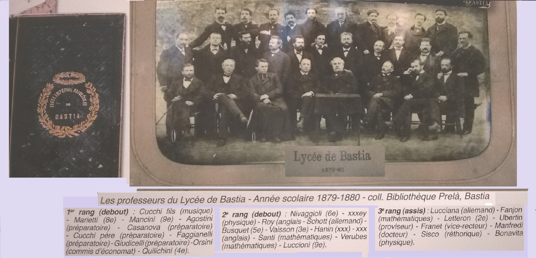 « ... Avec de solides bases acquises à l’école du village, il entra au lycée de Bastia en octobre 1915. Une brillante scolarité lui permit d’affronter la Faculté des Lettres et de terminer une licence d’histoire. Après un bref séjour sur le continent comme maître d’internat puis professeur-adjoint, il retourna professeur à son lycée(en 1934) et y demeura jusqu’à sa mise à la retraite en 1964. » (*S.-J. Vinciguerra p. 14)